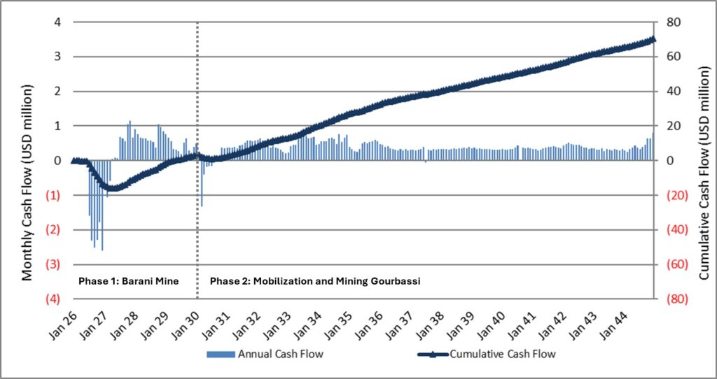 The SMSZ Project is expected to generate a total after-tax free cash flow of $71 million, averaging about $4.1 million per year over the 17.4-year mine life. Cash flow is generally steady across the life of the project, with a slight dip expected during the transition between mining at Barani and Gourbassi. This reflects the planned relocation and commissioning of the modular processing plant and is already accounted for in the overall schedule and financials.