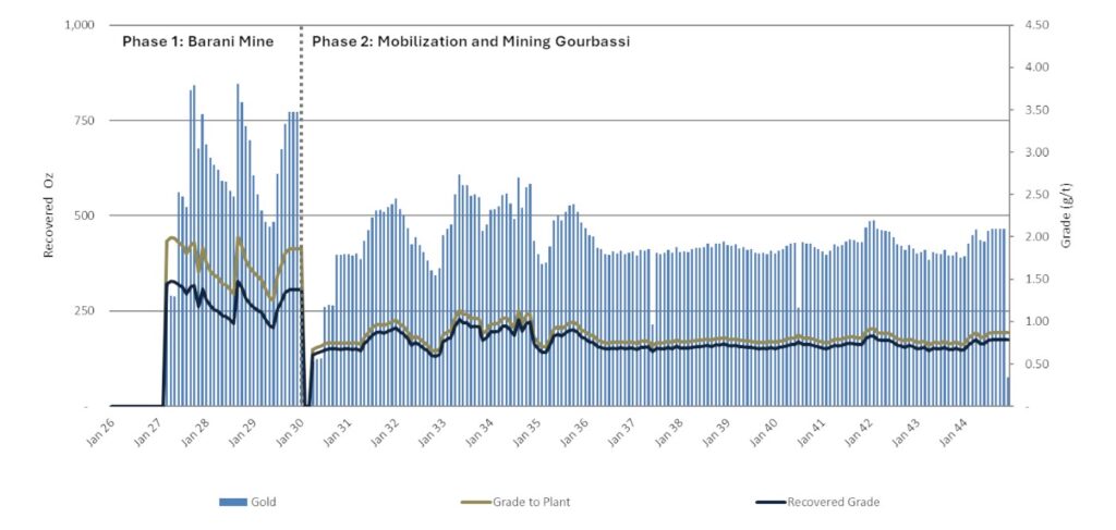 Average annual gold production over the life of mine is estimated at 5,500 ounces (or ~458 ounces per month), with total payable gold production projected at approximately 97,600 ounces across both the Barani and Gourbassi deposits.