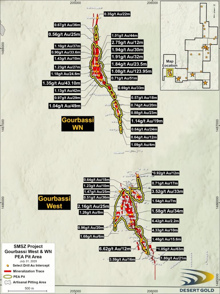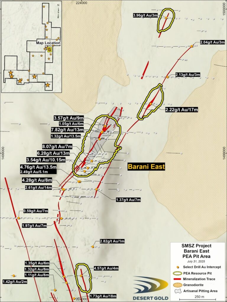 Delta, British Columbia, August 7, 2025 – Desert Gold Ventures Inc. (TSX.V: DAU, FSE: QXR2, OTC: DAUGF) (“Desert Gold” or the “Company”) is pleased to announce the results of its maiden Preliminary Economic Assessment (“PEA”) for the Barani and Gourbassi deposits, located on its 100%-owned SMSZ Gold Project in western Mali.