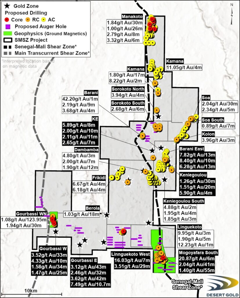 Desert Gold’s flagship 440km2 SMSZ Project is located in the country of Mali and overlies a 38 km section of West Africa’s prolific Senegal Mali Shear Zone which is related to 4 tier one gold mines including B2 Gold’s Fekola Mine, Barrick’s Gounkoto and Loulo Mines and Allied Gold’s Sadiola and Yatela Mines.